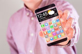 smartphone rezygnować przeźroczysty ekran w ludzkich rąk.