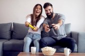 Zdjęcie "Mąż i żona grają w gry wideo z joystickami w salonie. Kochająca się para gra w gry wideo w domu." może być wykorzystywane do celów osobistych i komercyjnych zgodnie z warunkami zakupionej licencji Royalty-free. Obraz jest dostępny do pobrania w jakości wysokiej rozdzielczości do 5760x3840.