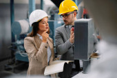 Biznesmen i bizneswoman w fabryce. Dwie profesjonalne osoby z kaskami pracujące w kontroli jakości na fabrycznej linii produkcyjnej.