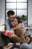 Mąż zaskakuje żonę prezentem. Młody mężczyzna daje pudełko prezentów swojej żonie.