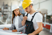 Pracownik fabryki i inżynier przeprowadzający inspekcję. Pracownik fabryki i bizneswoman na linii produkcyjnej.