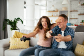 Zdjęcie "Mąż i żona grają w gry wideo z joystickami w salonie. Kochająca się para gra w gry wideo w domu." może być wykorzystywane do celów osobistych i komercyjnych zgodnie z warunkami zakupionej licencji Royalty-free. Obraz jest dostępny do pobrania w jakości wysokiej rozdzielczości do 5760x3840.