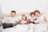 Piękni rodzice z dziećmi bawiącymi się w domu. Młoda rodzina ogląda film na laptopie