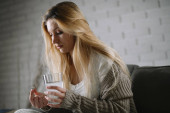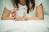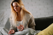 Chory dzień w domu. Piękna młoda kobieta złapała przeziębienie lub grypę w swoim mieszkaniu.