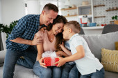 Ojciec z dwoma młodymi synami daje matce dar. Matka jest zaskoczona, że otrzymuje prezent od synów i męża.