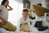 Zdjęcie "Młodzi rodzice z synami walczący poduszki na łóżku. Szczęśliwa matka i ojciec z chłopcami bawiącymi się w domu." może być wykorzystywane do celów osobistych i komercyjnych zgodnie z warunkami zakupionej licencji Royalty-free. Obraz jest dostępny do pobrania w jakości wysokiej rozdzielczości do 5760x3840.