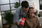 Zdjęcie "Urodziny żony. Mąż zaskakuje żonę tortem urodzinowym." może być wykorzystywane do celów osobistych i komercyjnych zgodnie z warunkami zakupionej licencji Royalty-free. Obraz jest dostępny do pobrania w jakości wysokiej rozdzielczości do 5760x3840.
