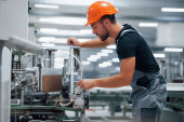 Zdjęcie "Pracownik fabryki na linii produkcyjnej. Człowiek w żółtym hełmie pracuje w fabryce." może być wykorzystywane do celów osobistych i komercyjnych zgodnie z warunkami zakupionej licencji Royalty-free. Obraz jest dostępny do pobrania w jakości wysokiej rozdzielczości do 5760x3840.