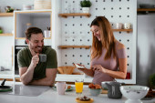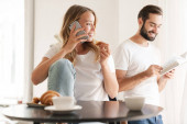 Zdjęcie "szczęśliwy para jedzenie śniadanie w kuchni " może być wykorzystywane do celów osobistych i komercyjnych zgodnie z warunkami zakupionej licencji Royalty-free. Obraz jest dostępny do pobrania w jakości wysokiej rozdzielczości do 5760x3840.