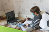 Zdjęcie "młoda kobieta w masce patrzy na swojego smartfona cały uczy się z domu w świetlicy" może być wykorzystywane do celów osobistych i komercyjnych zgodnie z warunkami zakupionej licencji Royalty-free. Obraz jest dostępny do pobrania w jakości wysokiej rozdzielczości do 5760x3840.