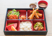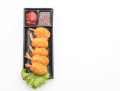 (sushi inari) sushi ryż zawinięty w suszone tofu ze smażonymi krewetkami i smażonym kurczakiem w zestawie bento - japoński styl żywności