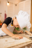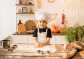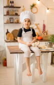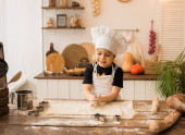 mały chłopiec w stroju szefa kuchni siedzi przy stole z wałkiem i ciastem w kuchni