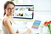 młoda kobieta fotograf wybierając Zdjęcia