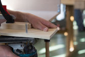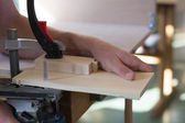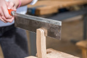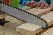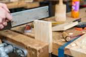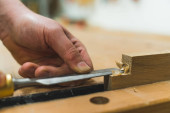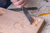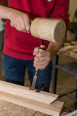 Stolarz pracuje z drewna dłutem i młotkiem - zbliżenie rzemiosła