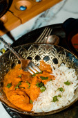 Zdjęcie "Autentyczne dania kuchni indyjskiej kurczaka tikka masala z kolendry i cytryny twist ozdobić" może być wykorzystywane do celów osobistych i komercyjnych zgodnie z warunkami zakupionej licencji Royalty-free. Obraz jest dostępny do pobrania w jakości wysokiej rozdzielczości do 5760x3840.