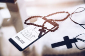 Czytelnik kart w ręku księdza podczas wizyty duszpasterskiej.