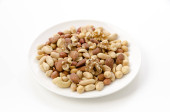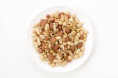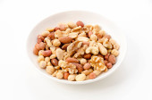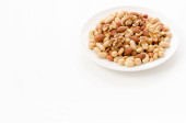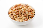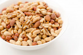 Pieczone solone orzeszki ziemne na białym talerzu na białym tle