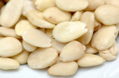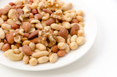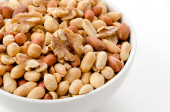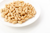 Pieczone solone orzeszki ziemne na białym talerzu na białym tle