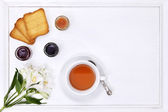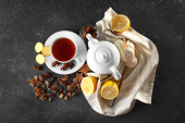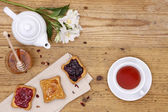 filiżankę herbaty i czajnik z przyprawami, buiscuits i miód na ta
