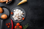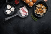 Zdrowe składniki śniadaniowe dla jaj smażonych w żeliwnej patelni, na czarnym tle, widok z góry płaskie układanki, z miejscem na tekst copyspace