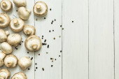 Królewskie czempiony, paryskie champignons zestaw, na starym ciemnym drewnianym tle tabeli, widok z góry płaski leżał