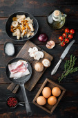 Zdrowe składniki śniadaniowe dla zestawu jaj smażonych, na starym ciemnym drewnianym tle stołu, z miejscem na tekst copyspace