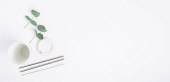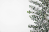 Rama, róg wykonany z zielonych liści eukaliptusa i gałęzi na białym tle. Kompozycja kwiatowa. Kobiecy styl akcji płaski świecki obraz, widok z góry. Przestrzeń kopiowania.