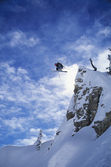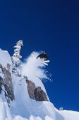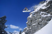 Czarno-białe zdjęcie snowboardzisty skaczącego z górskiej półki