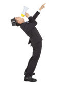 biznesmen trzymający walizkę i oglądający smartfona