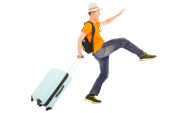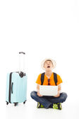 śmieszne biznesmen umieścić na sprzęcie Scuba i posiadania bagażu