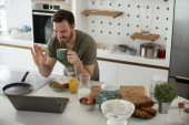 Młody człowiek je śniadanie i czyta wiadomości online.