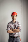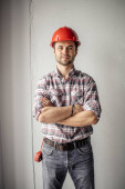 Portret młodego przystojnego pracownika w fabryce z narzędziami na tle