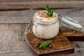 Kurczak w szklanym słoiku na brązowym drewnianym stole kuchennym. Filet z kurczaka domowej roboty pasztet z przyprawami na drewnianym tle