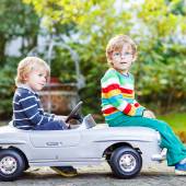 Zdjęcie "Dwoje szczęśliwych dzieci bawiących się dużym starym samochodzikiem w letnim ogrodzie, na świeżym powietrzu. Chłopak prowadzi samochód z małą dziewczynką, urocza siostra w środku. Śmiejące się i uśmiechnięte dzieci. Rodzina, dzieciństwo, koncepcja stylu życia." może być wykorzystywane do celów osobistych i komercyjnych zgodnie z warunkami zakupionej licencji Royalty-free. Obraz jest dostępny do pobrania w jakości wysokiej rozdzielczości do 5760x3840.