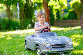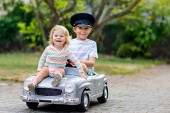 Dwoje szczęśliwych dzieci bawiących się dużym starym samochodzikiem w letnim ogrodzie, na świeżym powietrzu. Chłopak prowadzi samochód z małą dziewczynką, urocza siostra w środku. Śmiejące się i uśmiechnięte dzieci. Rodzina, dzieciństwo, koncepcja stylu życia.