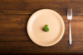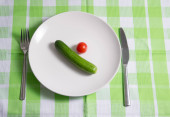 Odchudzanie dieta niskokaloryczny pojedynczy liść sałaty na białym talerzu sztućce na czerwonym tle tkaniny z drewnianym stole