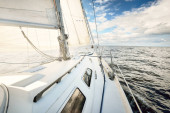 Zdjęcie "Biały jacht żeglujący po zachodzie słońca. Widok z bliska od pokładu do dziobu. Jasne błękitne niebo z świecącymi chmurami odbitymi w nieruchomej wodzie. Sielankowy pejzaż morski. Morze, rejs, cele podróży" może być wykorzystywane do celów osobistych i komercyjnych zgodnie z warunkami zakupionej licencji Royalty-free. Obraz jest dostępny do pobrania w jakości wysokiej rozdzielczości do 5760x3840.