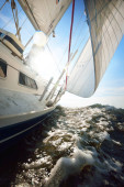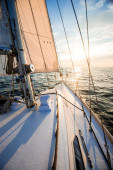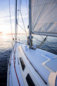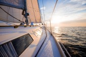 Biały jacht żeglujący po zachodzie słońca. Widok z bliska od pokładu do dziobu. Jasne błękitne niebo z świecącymi chmurami odbitymi w nieruchomej wodzie. Sielankowy pejzaż morski. Morze, rejs, cele podróży
