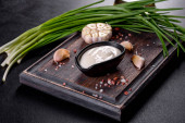 Sos czosnkowy w ceramicznym czarnym sosie z zielenią na drewnianej desce do krojenia na ciemnym betonie