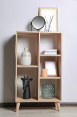 Zdjęcie "Półka z różnych wystroju i roślin domowych w pobliżu białej ściany w pokoju. Projekt wnętrza" może być wykorzystywane do celów osobistych i komercyjnych zgodnie z warunkami zakupionej licencji Royalty-free. Obraz jest dostępny do pobrania w jakości wysokiej rozdzielczości do 5760x3840.