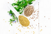 Mąka gryczana z brązowych i zielonych zbóż w dwóch miskach, łyżki z różną kaszą gryczaną, kwiaty i liście na tle jasnodrewnianej deski z góry