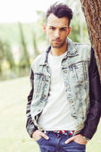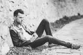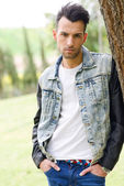 atrakcyjny młody przystojny mężczyzna, model moda w miejskich backgro