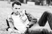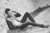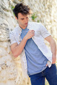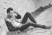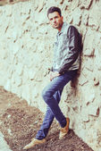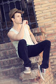 atrakcyjny młody przystojny mężczyzna, model moda w miejskich backgro