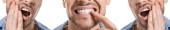 Żółty uszkodzony ząb uśmiechniętego białego mężczyzny w zbliżeniu. Przed - po. Skup się na zębach. Problemy z zębami, martwe zęby, wybielanie szkliwa, estetyczna renowacja. Naturalna emalia, pozytywny wpływ na organizm