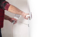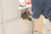 Facet przecina rurę iskrami szlifierki. Widok boczny procesu pracy z szlifierką
