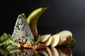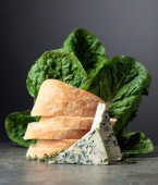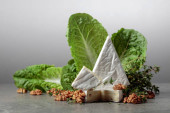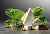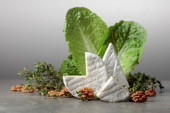 Świeży ser Brie z sałatą, tymiankiem i orzechami włoskimi na szarym kamiennym stole.
