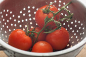 Świeże smaczne pomidory wiśniowe w kolandrze. Warzywa, kuchnia, dom
