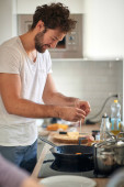 Młoda para zakochana dobrze się bawi przygotowując wspólnie śniadanie w piękny poranek. Gotowanie, razem, kuchnia, związek
