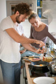 Zdjęcie "Młoda para zakochana dobrze się bawi przygotowując wspólnie śniadanie w piękny poranek. Gotowanie, razem, kuchnia, związek" może być wykorzystywane do celów osobistych i komercyjnych zgodnie z warunkami zakupionej licencji Royalty-free. Obraz jest dostępny do pobrania w jakości wysokiej rozdzielczości do 5760x3840.