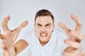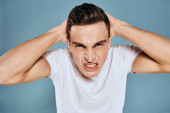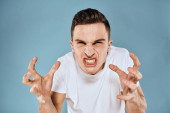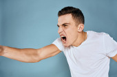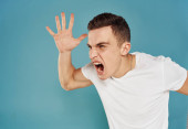 Człowiek gestykuluje rękami emocje biały t-shirt wyrażenie niebieskie tło
